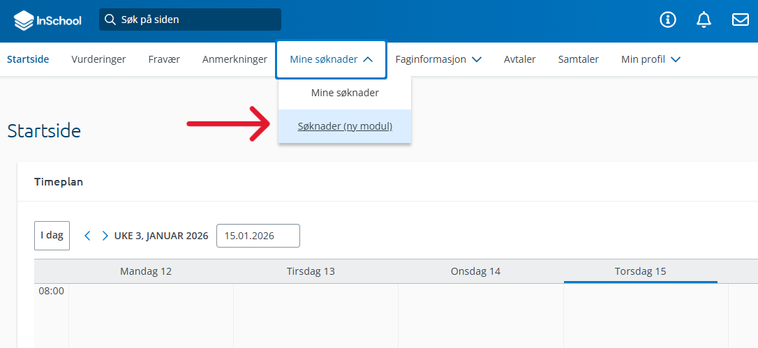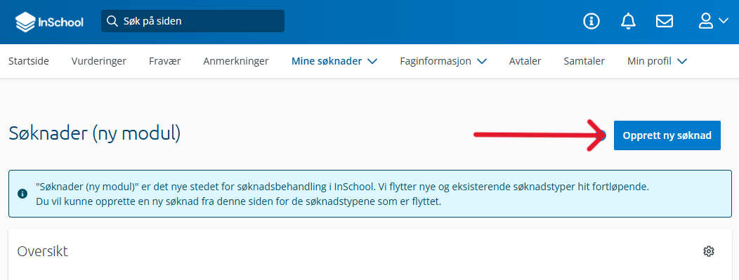Du vil se søknaden din i InSchool under Mine søknader - Søknader og hvor i saksbehanlinga søknaden din ligger. Når søknaden er ferdig behandlet vil du se svaret ditt her.