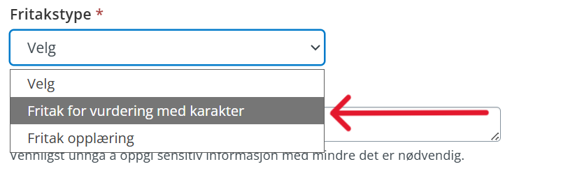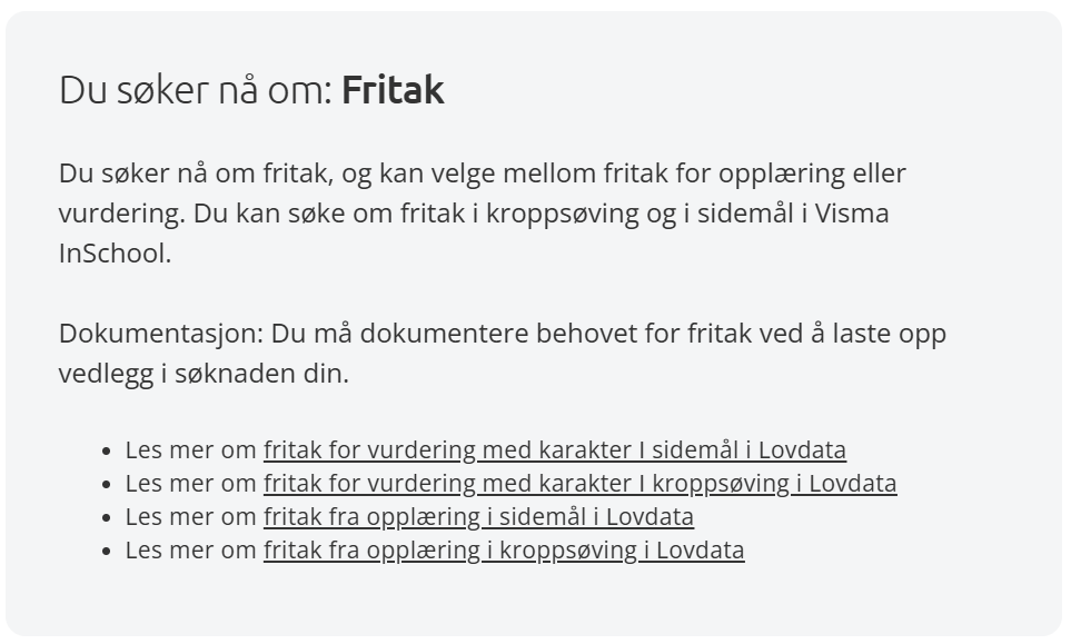 5. Du vil få opp hjelpetekst med informasjon om hva fritak innebærer. Les det som er relevant for deg.